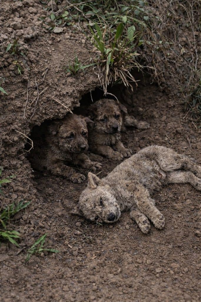 Inside a narrow dirt burrow, a litter of puppies had made their fragile home. No walls. No bedding. No protection from weather or hunger. Just packed soil and shadows.