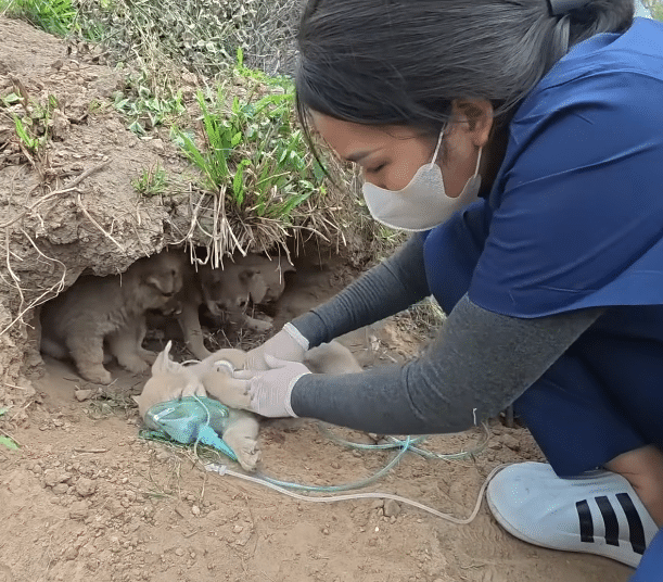 In a small dirt burrow beneath open sky, a group of puppies received more than medical care that day.
