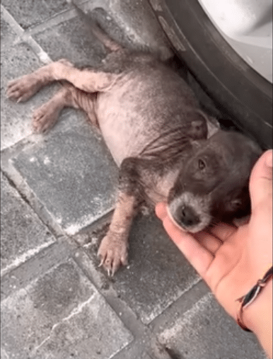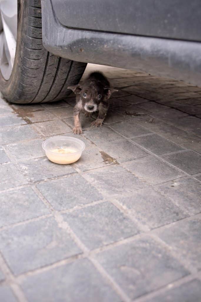 When the rescuer stepped outside and looked around, the sound led them to a parked car. Beneath it, pressed against the shadows, was a tiny puppy.