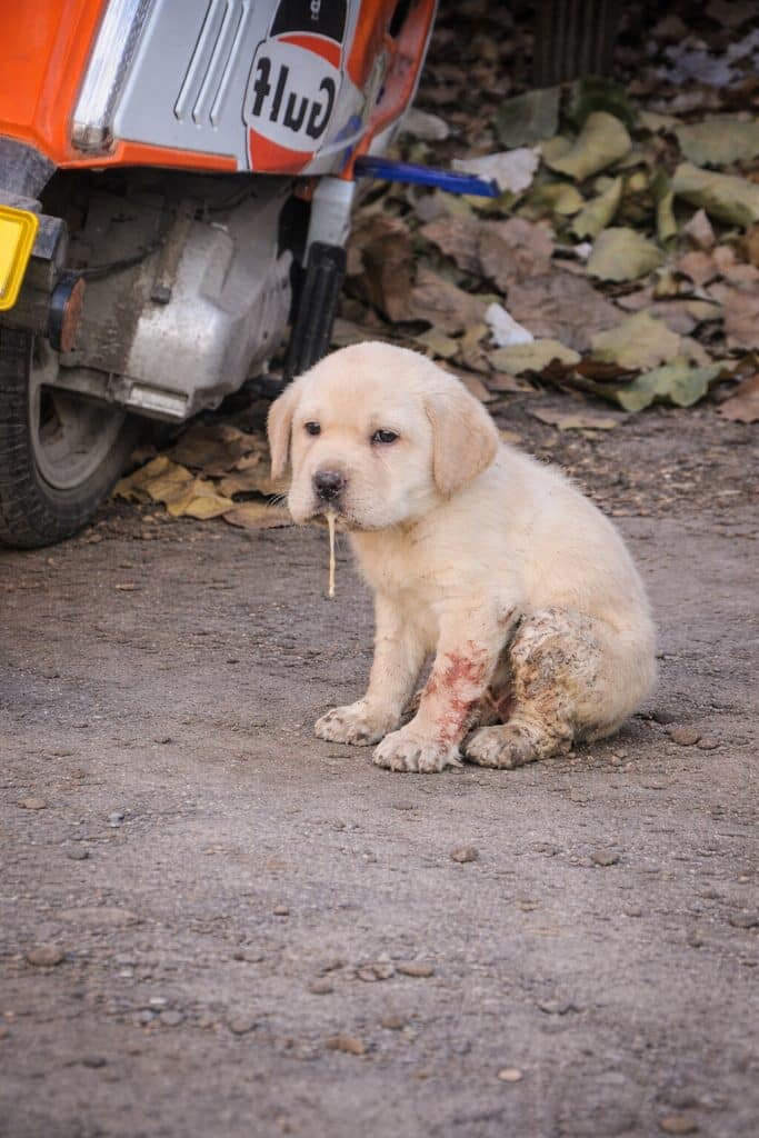 Late in December, on a cold street in Yantai, Shandong, a tiny Labrador puppy lay beside a parked motorbike.