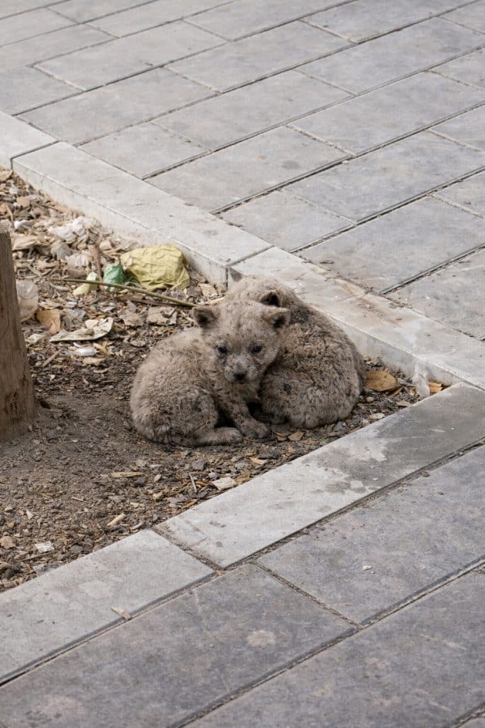 Two tiny puppies lying beneath a tree at the edge of the road. Curled close together. Quiet. Still.