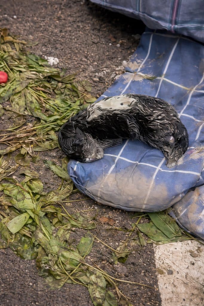 There, among torn blankets and discarded waste, lay three newborn puppies.