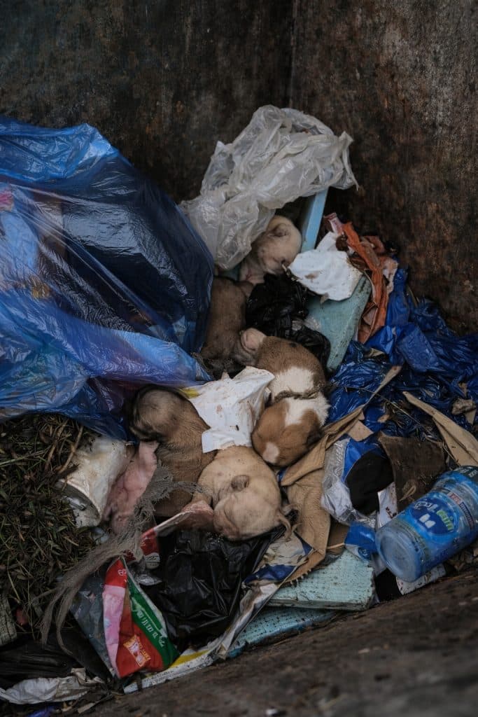 But beneath soaked plastic bags and scattered debris were eight newborn puppies.