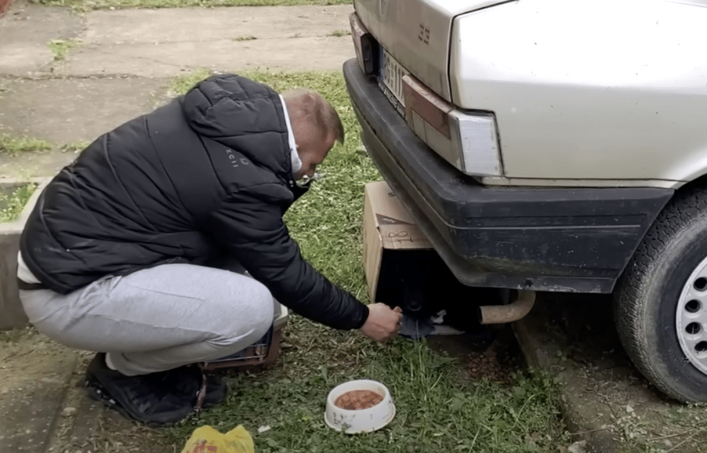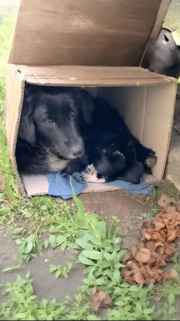 Seeing how thin and weak the mother was, the woman placed food nearby. At first, the dog hesitated, unwilling to leave her babies. Only when she saw they were safe did she step forward to eat, taking slow bites.