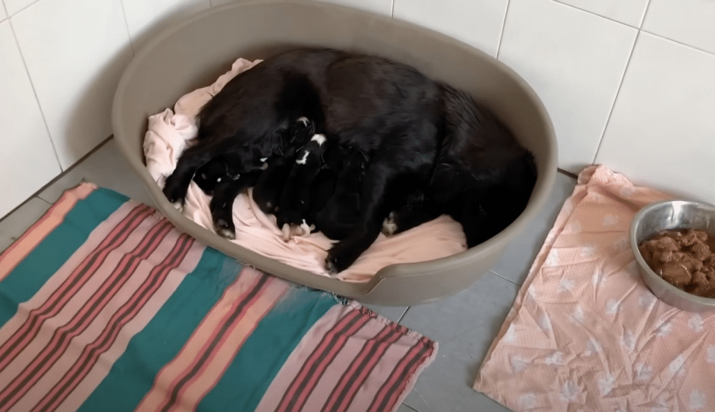 After the puppies finished nursing, their tiny faces were gently cleaned with a warm cloth. They squirmed slightly. The mother remained calm, watching closely. Fresh food and water were offered again, and this time she ate slowly—not desperate, not afraid.