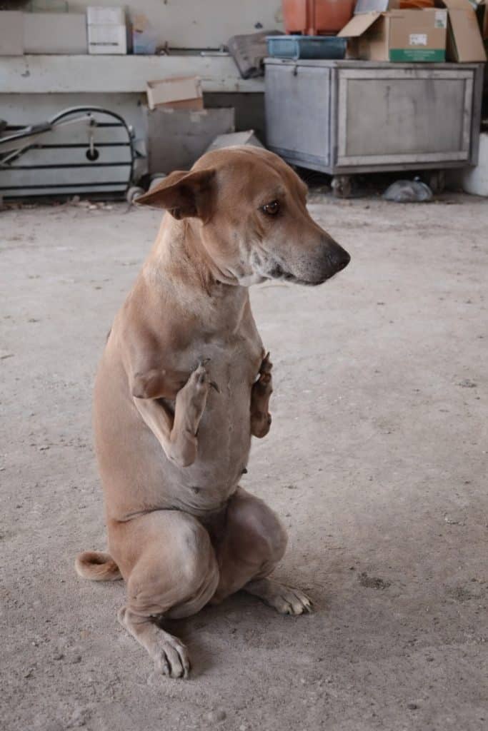 A brown dog, small and steady, stands upright on his two back legs. Where his front legs once were, there is only space — and yet, there is no collapse, no helplessness.