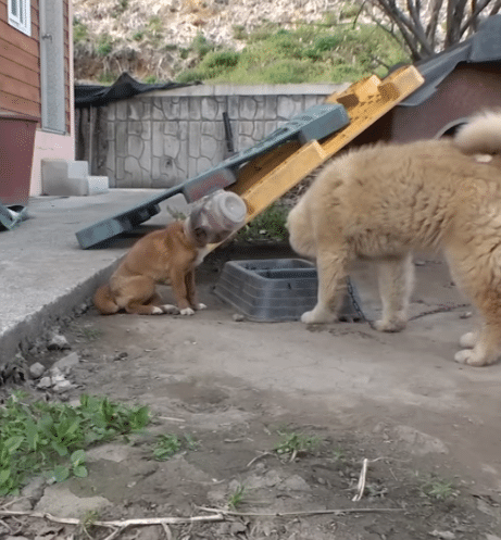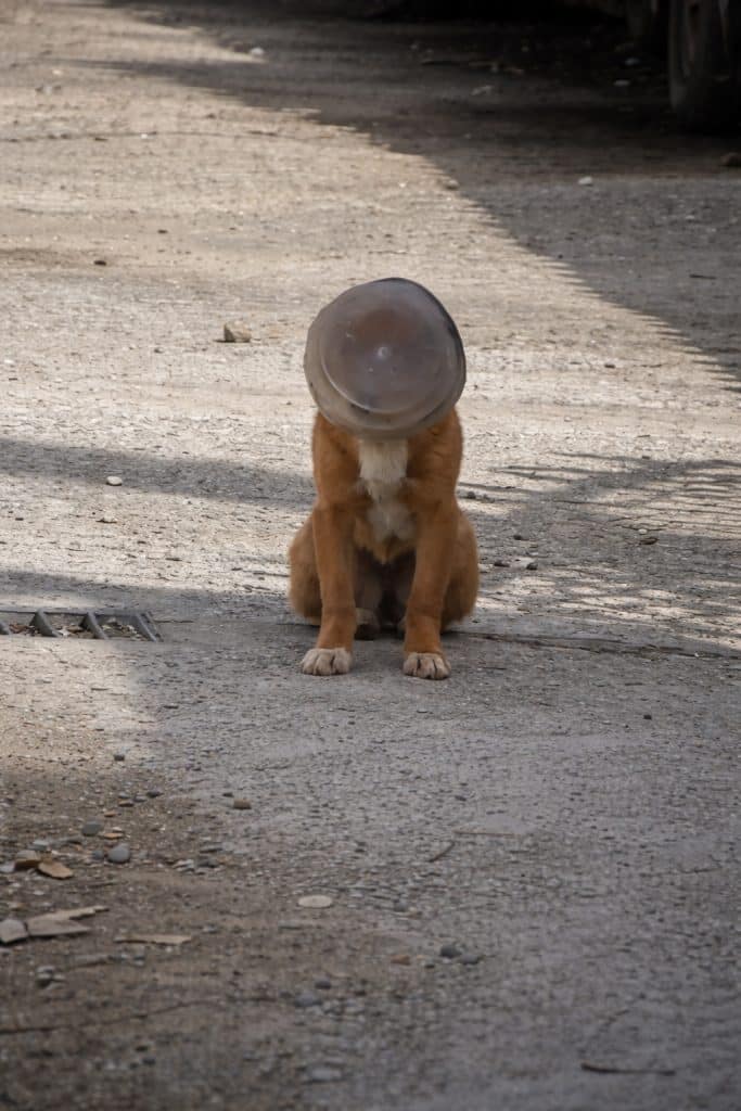 A stray dog was running through the streets with a large plastic container tightly stuck over his head. The bottle was long and rigid, sealed so firmly around his neck that he could not remove it himself.