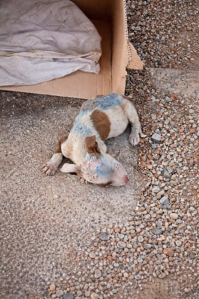 And there, barely noticeable inside a worn-out cardboard box, lay a tiny dog curled into himself as if trying to disappear.