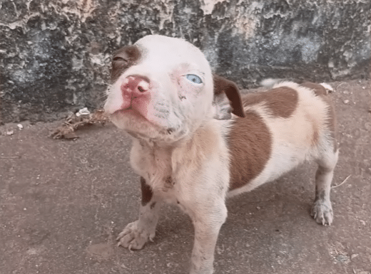 His body was painfully thin — ribs clearly visible beneath uneven, patchy fur. Small wounds dotted his skin, silent evidence of long neglect. His coat looked dull and broken, as though it had given up trying to protect him.