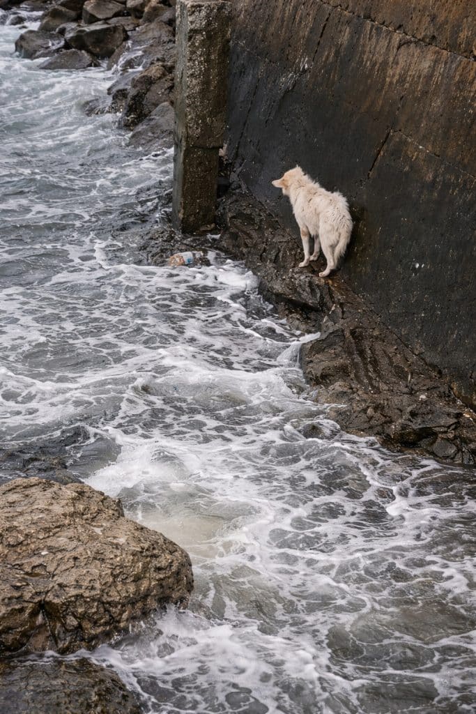The waves were powerful, surging unpredictably against the rocks. The dog, still frightened, shifted nervously with every crash of water. One wrong movement could send him slipping.