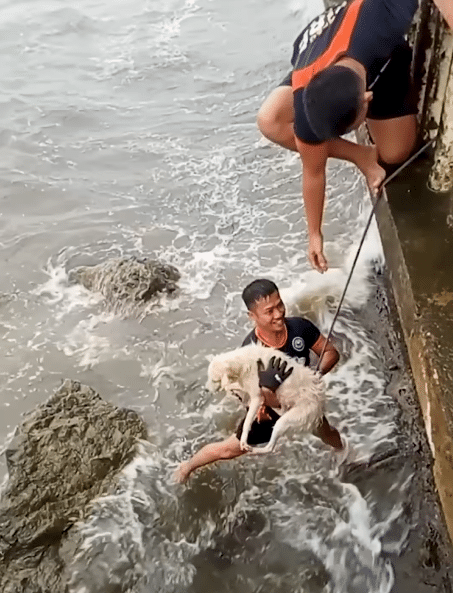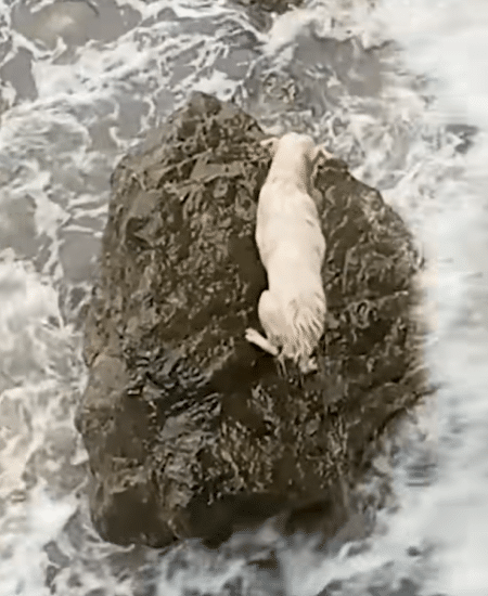 In the end, a frightened dog who had nearly been claimed by the sea was lifted back into safety by human hands willing to take the risk.