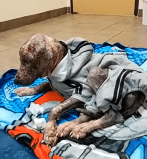 He was fitted with a protective recovery suit to prevent further irritation and self-injury. Medicated baths — including therapeutic LimePlus dips — became part of his routine to combat the aggressive skin infection.