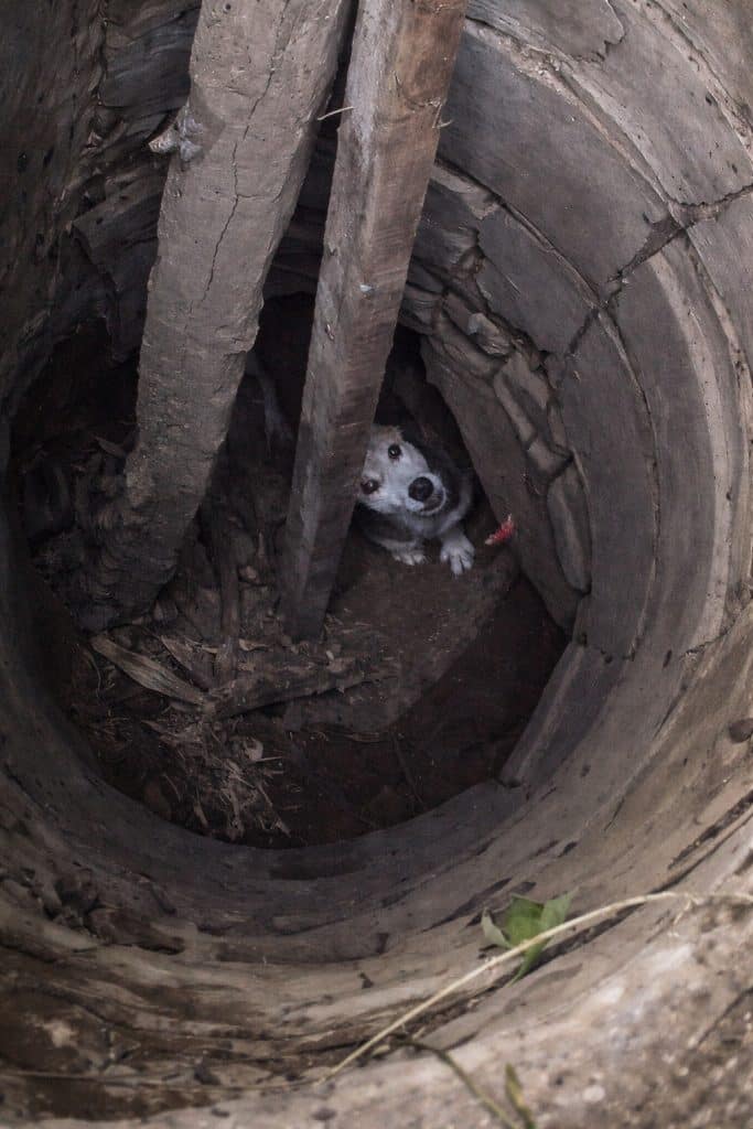 The well was narrow. There was barely enough space for one adult to stand comfortably beside the dog. The air felt heavy. The walls were slick.