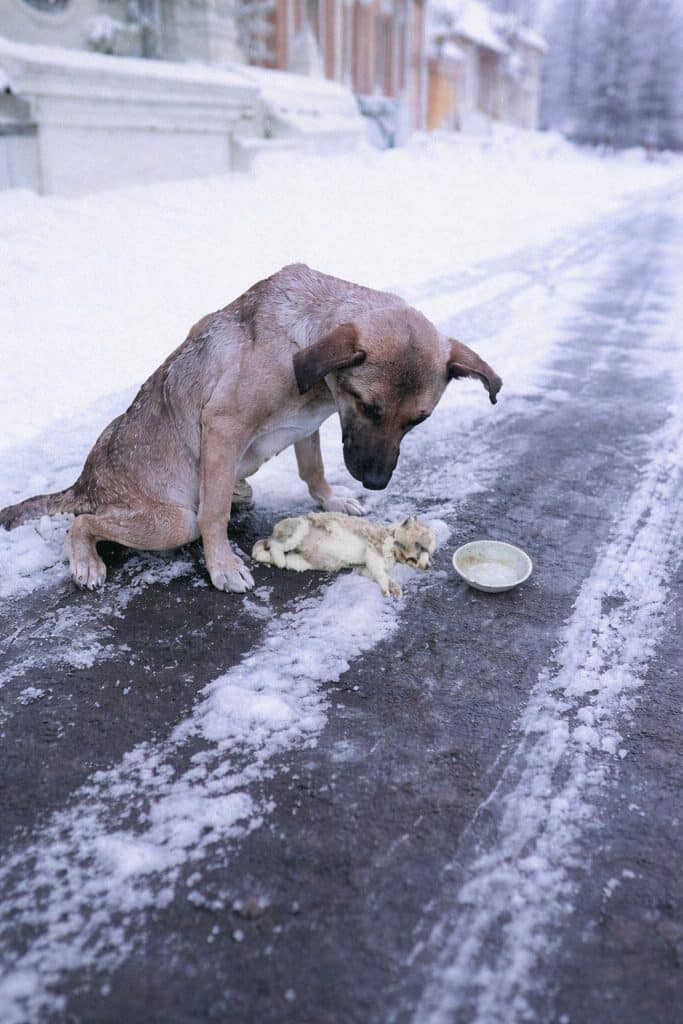 Her tiny puppy lay beside her, still and quiet.