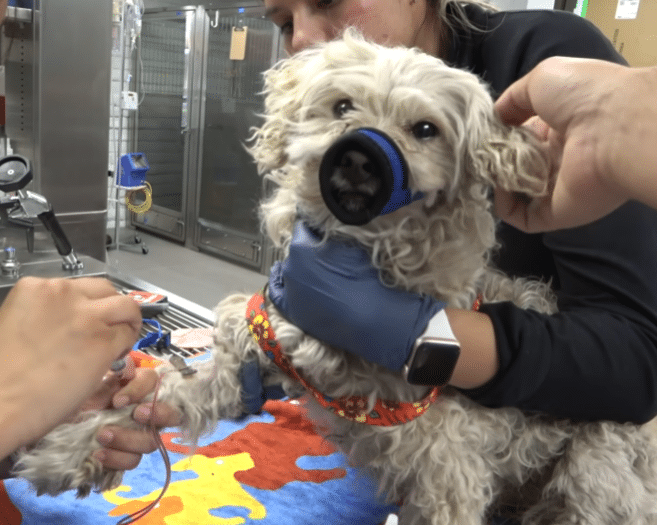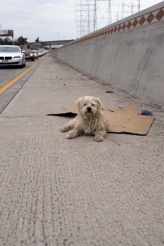 And in the middle of it all — on a narrow concrete divider — lay a tiny dog.