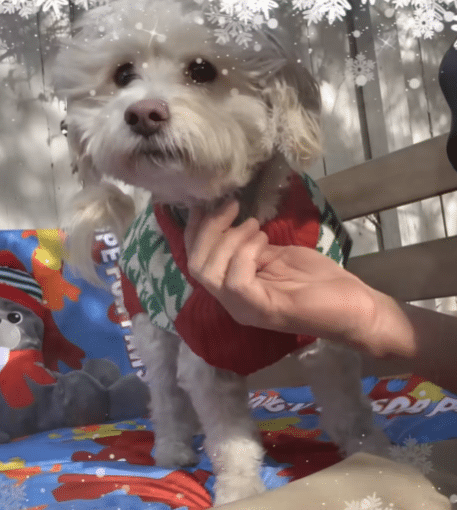 In the final moments of his journey, he is seen wearing a small Christmas sweater, moving confidently, curious and alert.