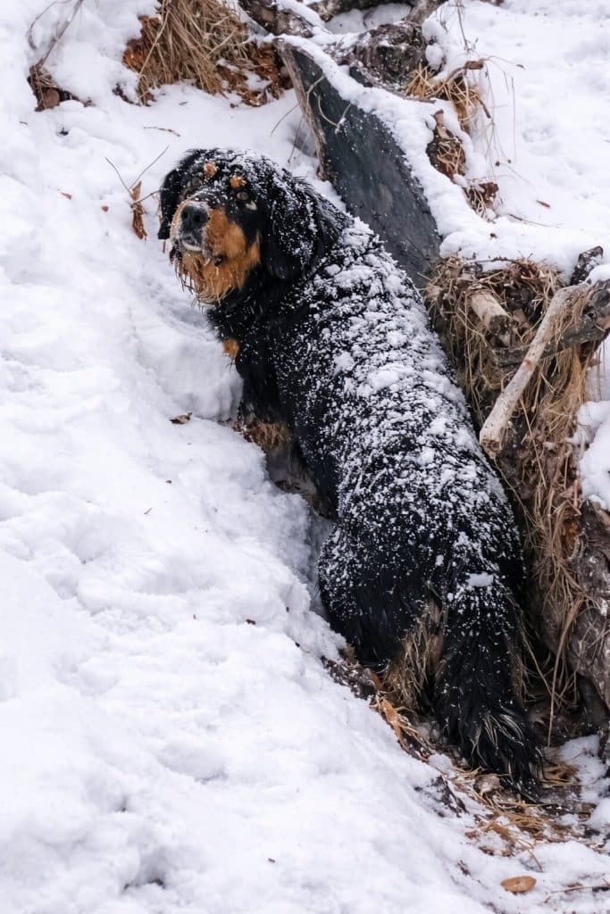 Curled tightly into the snow was a black dog — nearly invisible against the winter shadows. His body was stiff, partially frozen into the thick ice beneath him. He wasn’t moving.