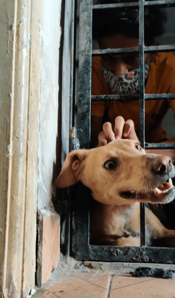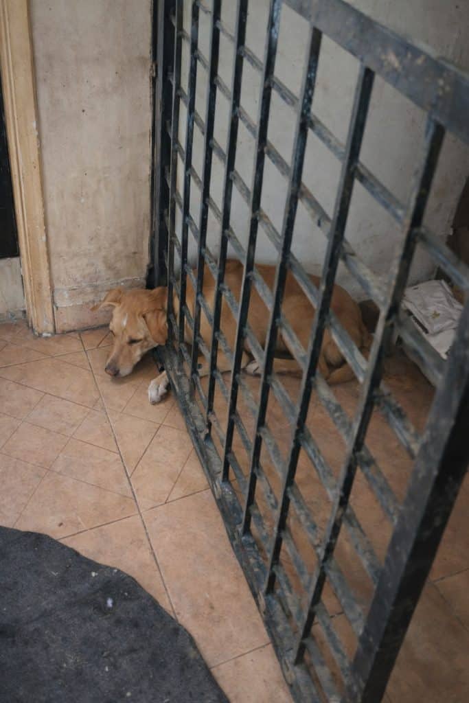 A golden-brown dog had wedged her head and neck between the narrow iron bars of a gate. The gap was far too tight. The more she struggled, the tighter it seemed to grip her.