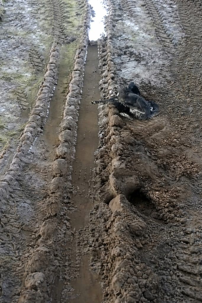 Beneath a busy overpass, where cars rushed by without slowing, a black dog lay motionless in the mud.