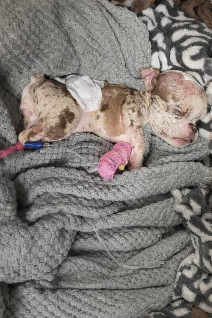 The puppy was severely hypoglycemic and dehydrated. There was strong suspicion of hydrocephalus — fluid accumulation in the brain.