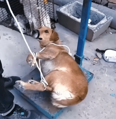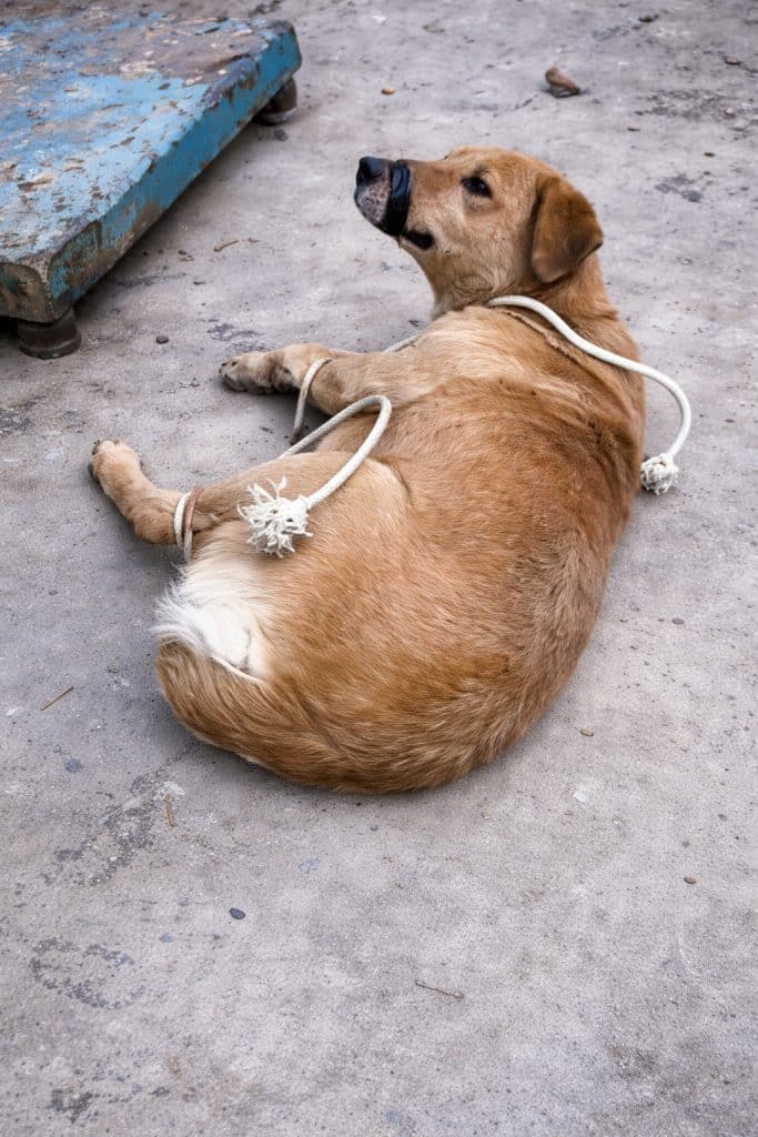 A pregnant dog stands quietly as her owner ties her legs and wraps thick black tape tightly around her muzzle. She doesn’t struggle. She doesn’t understand.