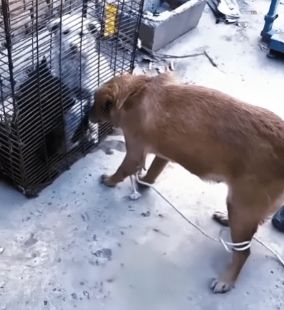 Nearby, a cramped metal cage holds several other dogs. They sit close together, waiting.