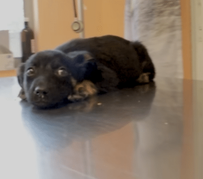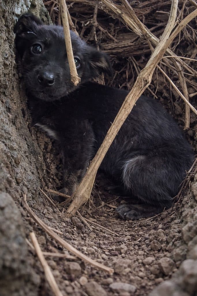 When she was first seen, the tiny black pup was tucked beneath a pile of dry branches, her body pressed flat against the ground. She had chosen a place that felt hidden — small enough to disappear into.