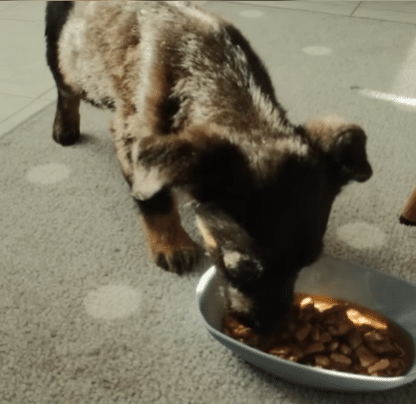 Her steps were cautious, but once she reached the bowl, hunger took over. She ate quickly — not aggressively, just urgently, as if she had learned not to expect the next meal.