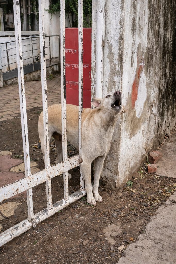 A stray dog had become wedged between the narrow bars of a white iron gate. His body was stuck halfway through, unable to move forward or backward. The space was too tight.