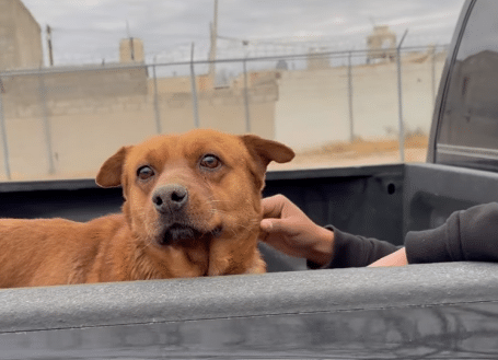 There, sitting quietly against a stained wall, is Mestizo — a brown dog with tired eyes and a body that seems smaller than it should be.