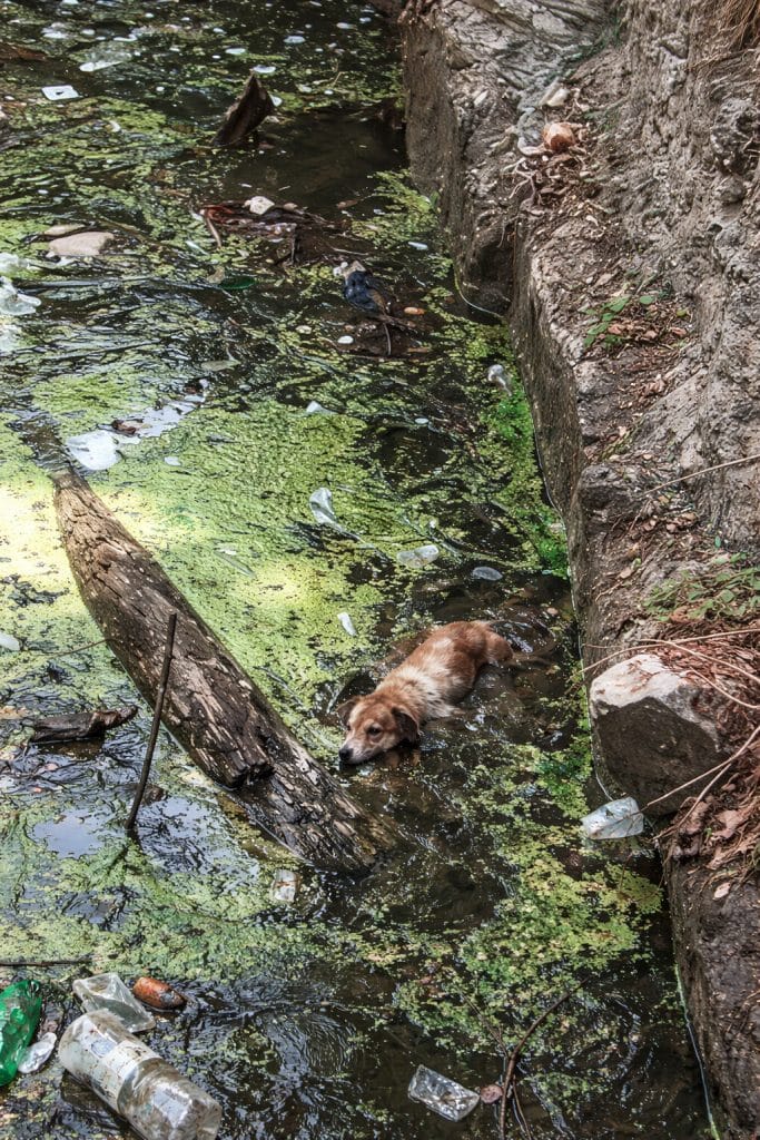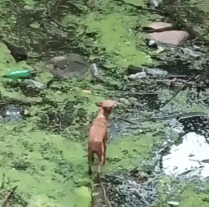 At the bottom of an old, abandoned well, a stray community dog stands trembling on a narrow stone ledge. Below him is stagnant green water, scattered with debris and broken branches.