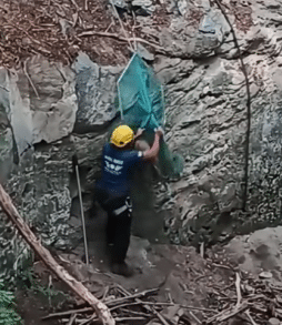 When the rescuer reaches the bottom, the dog reacts instinctively.