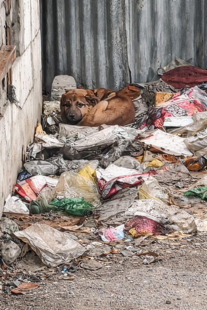 Galileo is lying motionless in the middle of a trash-strewn area, curled into himself as if trying to disappear. There is no strength left in his posture. No alertness in his body.