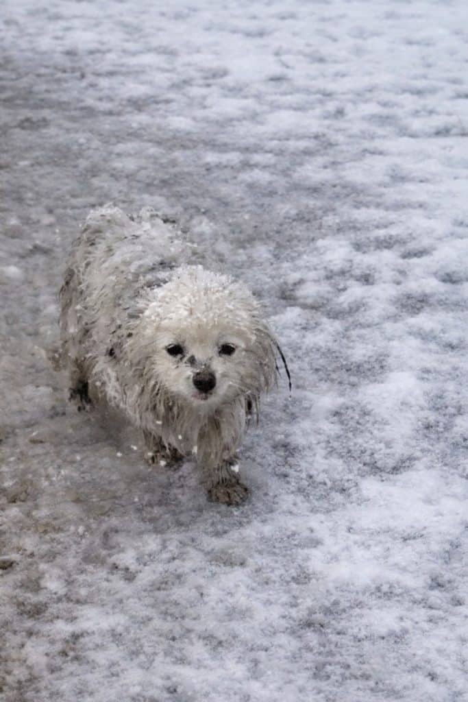 Where there was once a scruffy, frozen stray, there now stands a bright white, fluffy little dog.