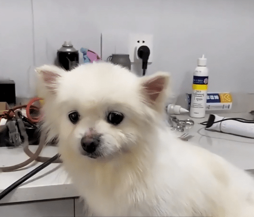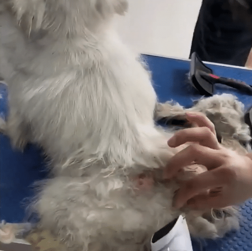 The little dog is taken to a professional grooming salon. His coat is carefully trimmed and shaved where necessary to remove dirt, ice buildup, and heavily matted fur.