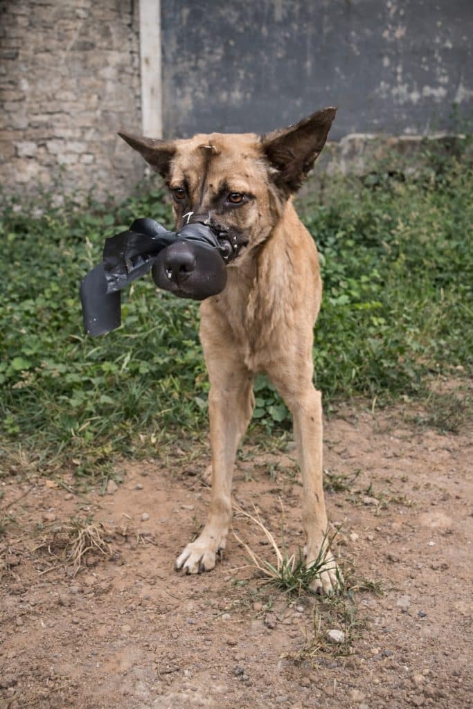 There, crouched in fear, was a dog with black tape tightly wrapped around her muzzle — and even across her eyes.