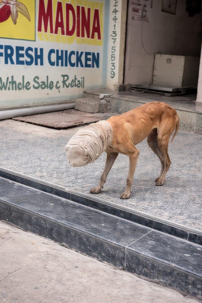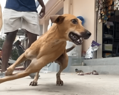 A thin, brown stray dog wanders through the street — but something is terribly wrong.