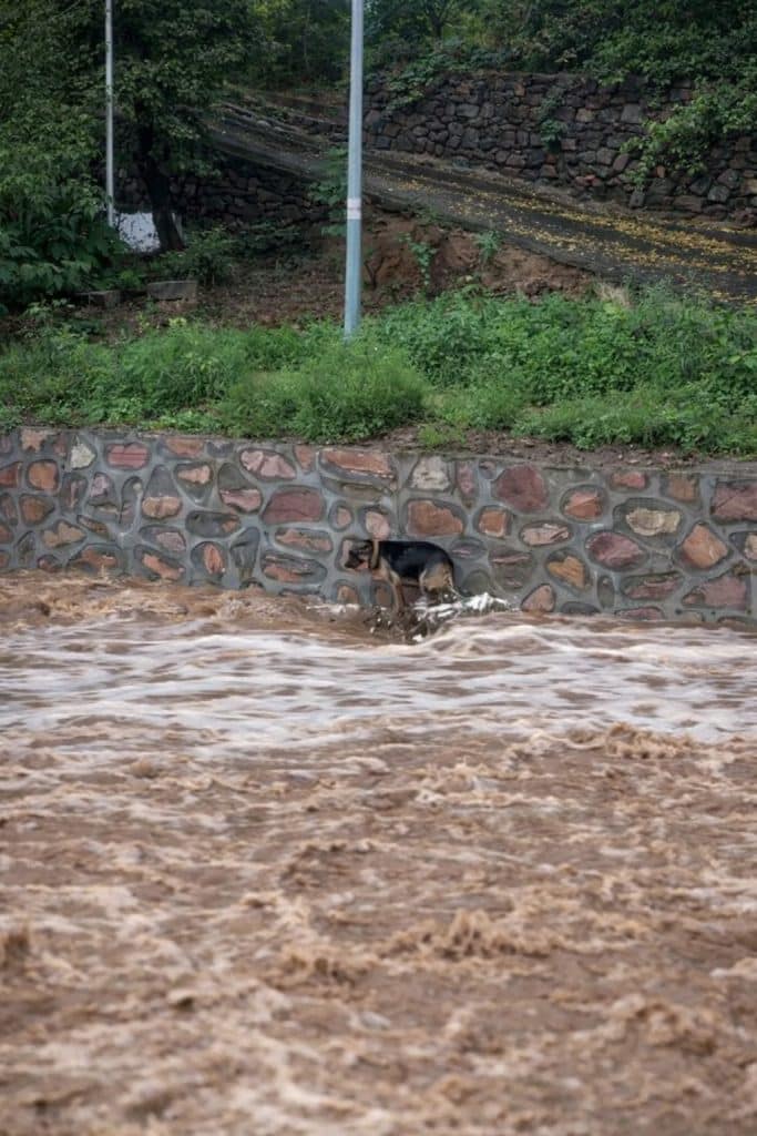 The dog, once trapped above raging water, now stands safely on the riverbank.