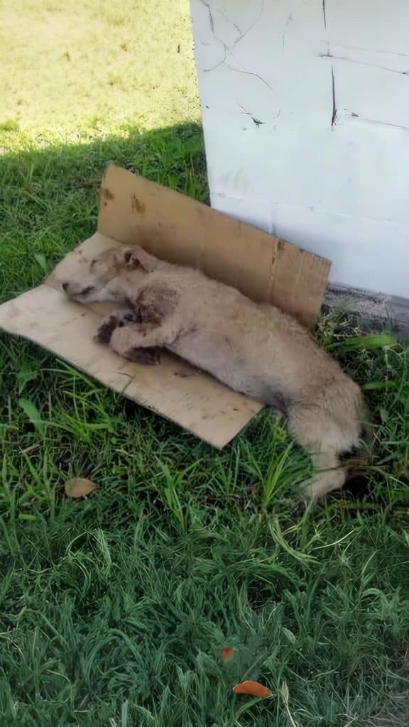 Near the edge of the road, under the shade of an old tree, sat a worn cardboard box. Sun-faded and bent at the corners, it looked like ordinary roadside debris. Inside, curled tightly and barely moving, was a small dog holding on with quiet determination.