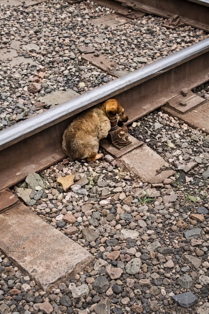 And right there, between steel rails and trembling ground, stood a small, dirty puppy.