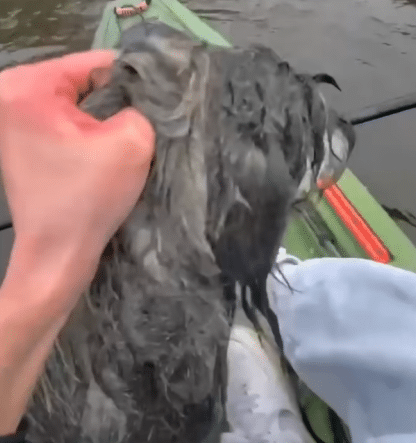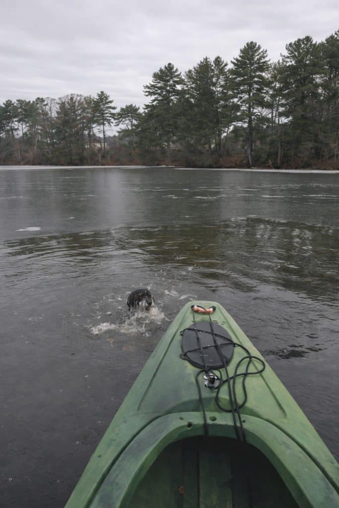 Water poured from the dog’s coat as he pulled him over the edge of the kayak and into his lap.
