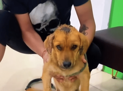 A rope was tied tightly around the dog’s abdomen. One leg lay at an unnatural angle, completely still. A deep scar marked the top of his head. His eyes were wet — not with aggression, not even with fear — but with quiet suffering.