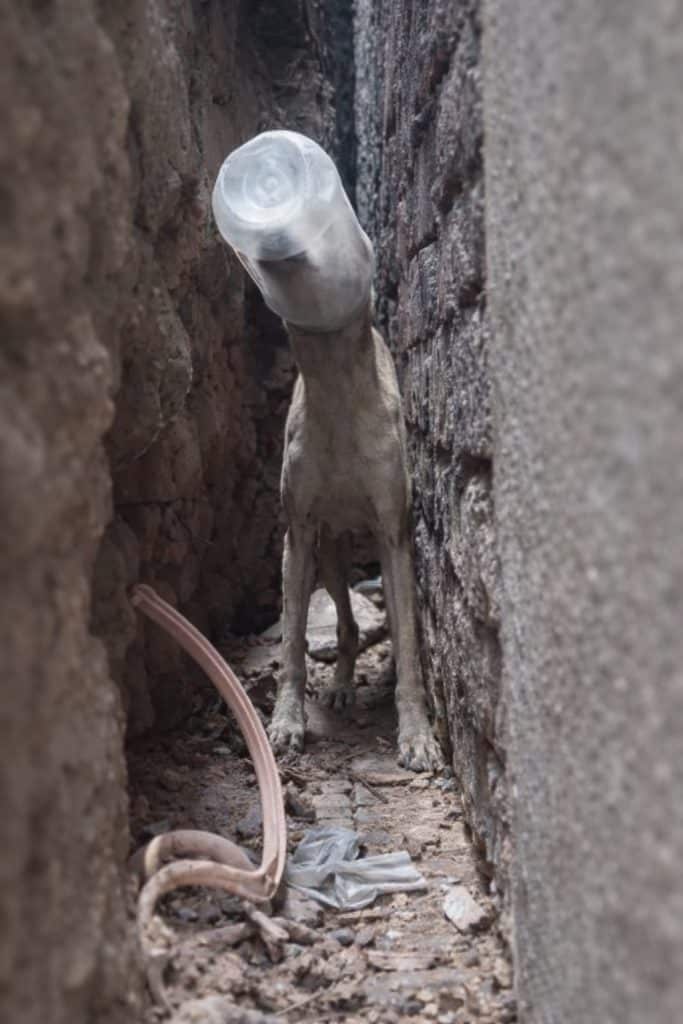 Discarded plastic waste left in streets, fields, or alleys can quickly become life-threatening hazards for animals. Curious dogs and wildlife often investigate containers searching for food — only to become trapped.