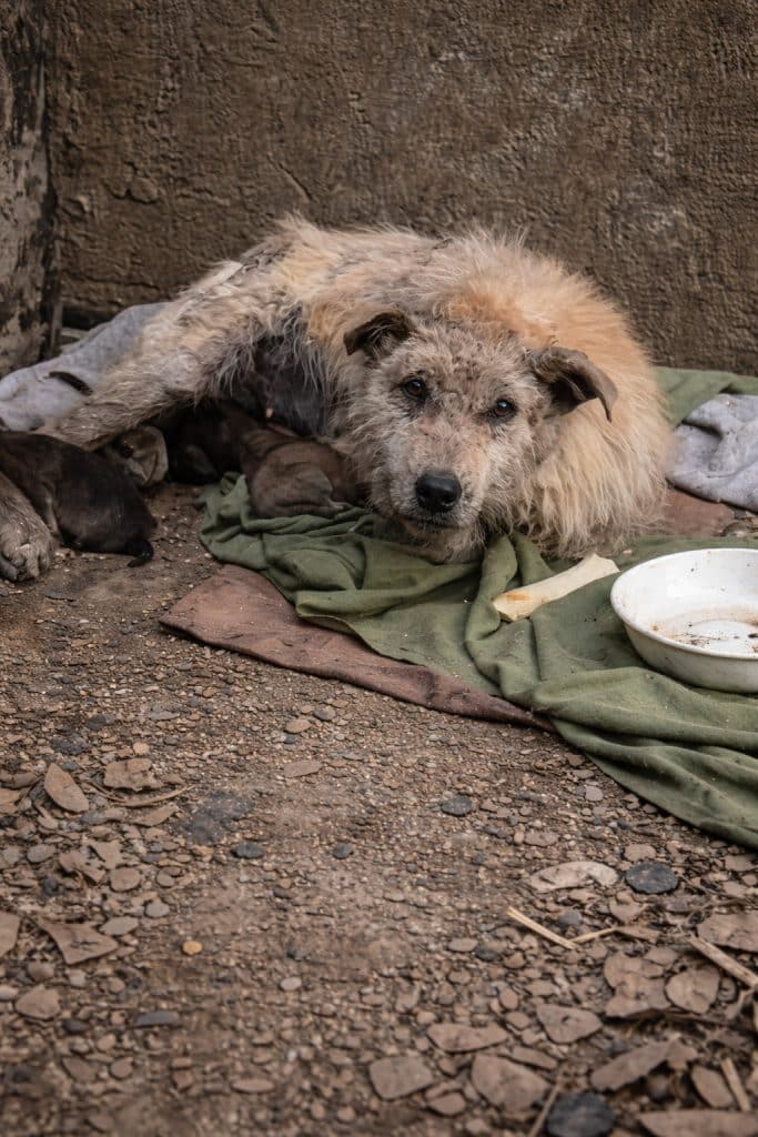 She was thin — painfully thin. Most of her fur had fallen out due to severe skin disease. Her body looked fragile, almost translucent in places. And yet, curled around her newborn puppies, she held herself upright with quiet determination.