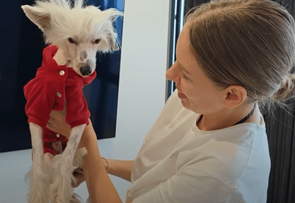 As the last of the heavy matting fell away, his delicate features emerged — expressive eyes, soft skin, and the distinctive look of a breed known for having very little body hair.