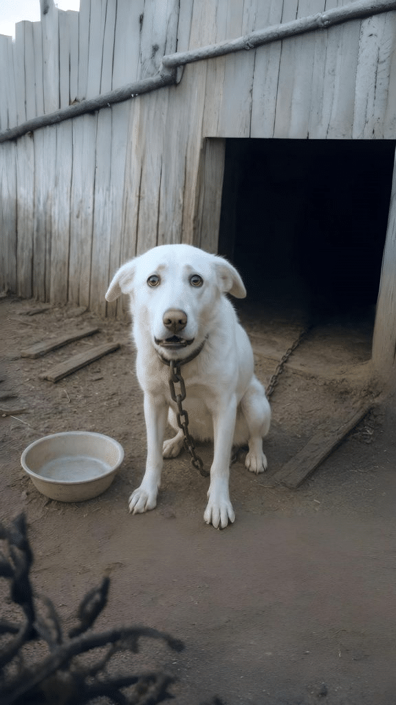 Bely’s body was painfully thin, his ribs sharply outlined beneath dull, brittle fur. A heavy, rusted chain was fastened around his neck, securing him to a metal post. It allowed only a few exhausted steps in any direction. Standing for long periods drained what little strength he had left.