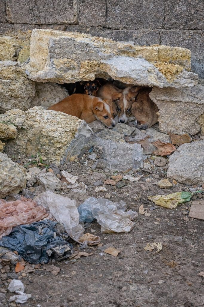 Under a cluster of cold stones, five tiny puppies pressed their bodies close together. They were trembling — not from cold alone, but from fear. Every sound made them retreat deeper into their rocky hiding place.