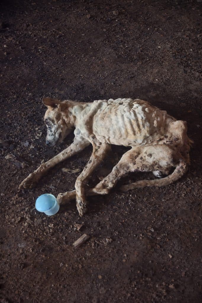 Under the dim glow of streetlights, a stray dog lies collapsed on the cold ground. His body is painfully thin — ribs visible, legs trembling from weakness. Open wounds mark his fragile frame. He doesn’t lift his head when the camera approaches.