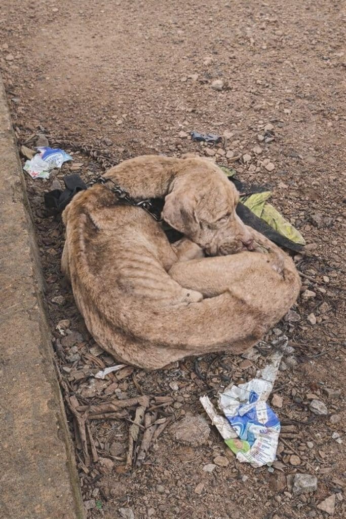 Around her lay scattered trash, dust, and debris. There was no bowl. No water. No shelter from sun or rain. Just a small, exhausted body tethered to neglect.