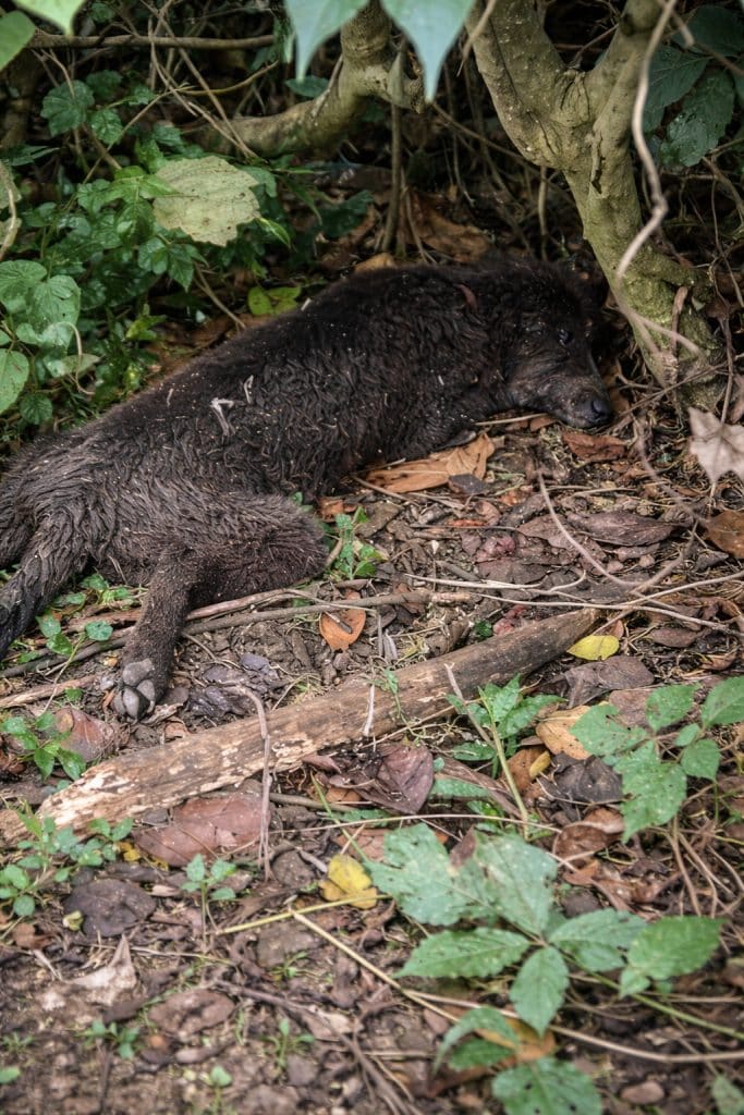 In a bush, barely visible against the wet ground, lay a tiny black puppy.